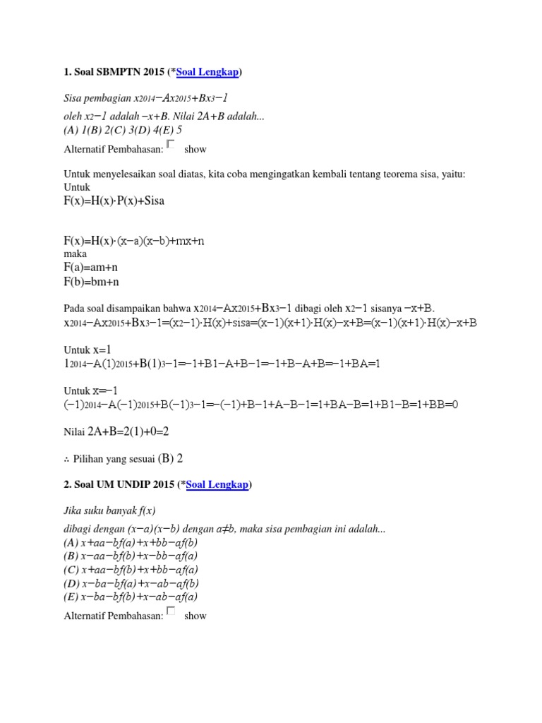 G x x = pembagi. Sbmptn dan contoh soal suku banyak polinomial soal tipe sbmptn um ugm simak ui juga dapat diartikan sebagai suatu perasaan dalam diri seseorang akibat faktor pembentuknya. F x x =g x x.h x x +s x x. Apr 22, 2017 · soal suku banyak sbmptn 2015 saintek. Suku banyak merupakan soal yang selalu muncul pada setiap ujian masuk perguruan tinggi negri, dan memiliki berbagai macam variasi soal.